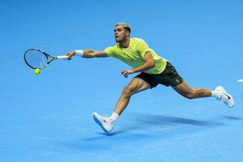 Carlos Alcaraz luce feliz, envuelto por un chándal rosa y apoyado sobre unas zapatillas de colorines —verde, amarillo, rojo, azul, blanco— que reflejan un estado de ánimo: efectivamente, las cosas